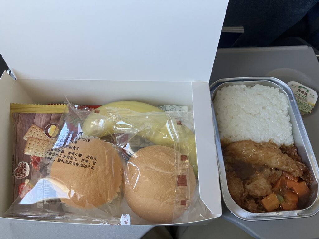 今回はフッシュを選びました。中国系の航空会社ではよくありますが、メイン以外のデザートやパンなどが別のボックスに入ってメインとは別々に配られます。