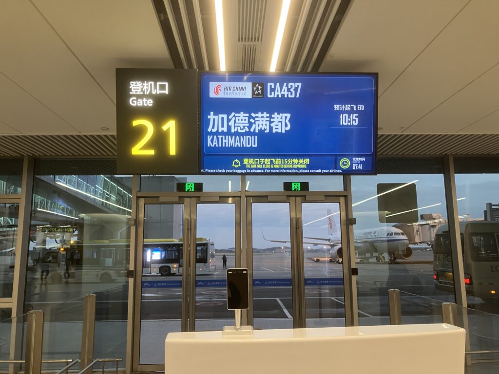 成都発、カトマンズ行きの便は搭乗口は21でした。成田から成都へ行くときと同じく、搭乗口からバスに乗って向かうタイプでした。
