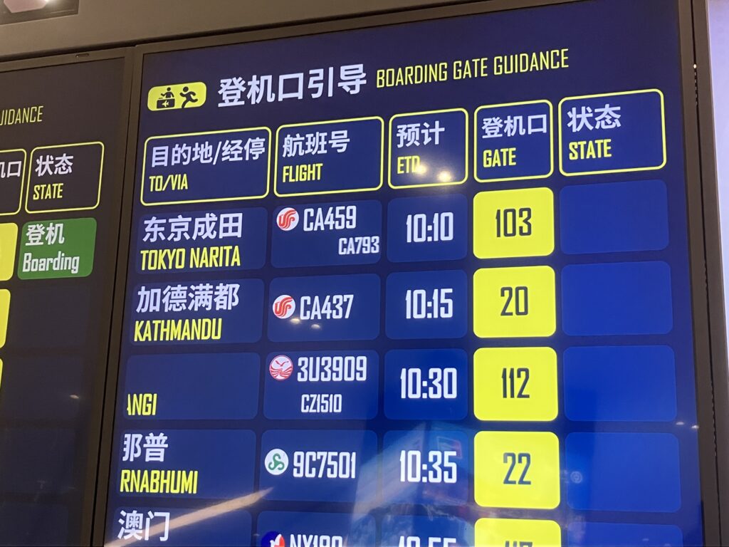 カトマンズ発、成都行きの便は搭乗口は4でした。国内線もそうだったのですが、ゲートの電光掲示板がきちんと情報を掲示してくれていません。フライト番号と時間がきちんと掲示されているゲートもあれば、されていないゲートもあります。