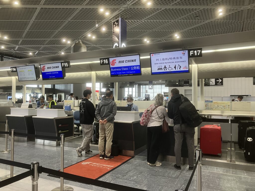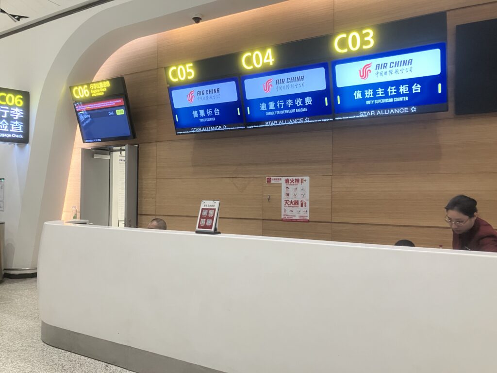 入国後、バゲージクレームエリアを抜けて、外に出ます。出口は2階ですが、4階の出発ロビーにある中国国際航空のカスタマーサービスカウンターに行き、ホテルからの迎えの車を手配してもらいます。