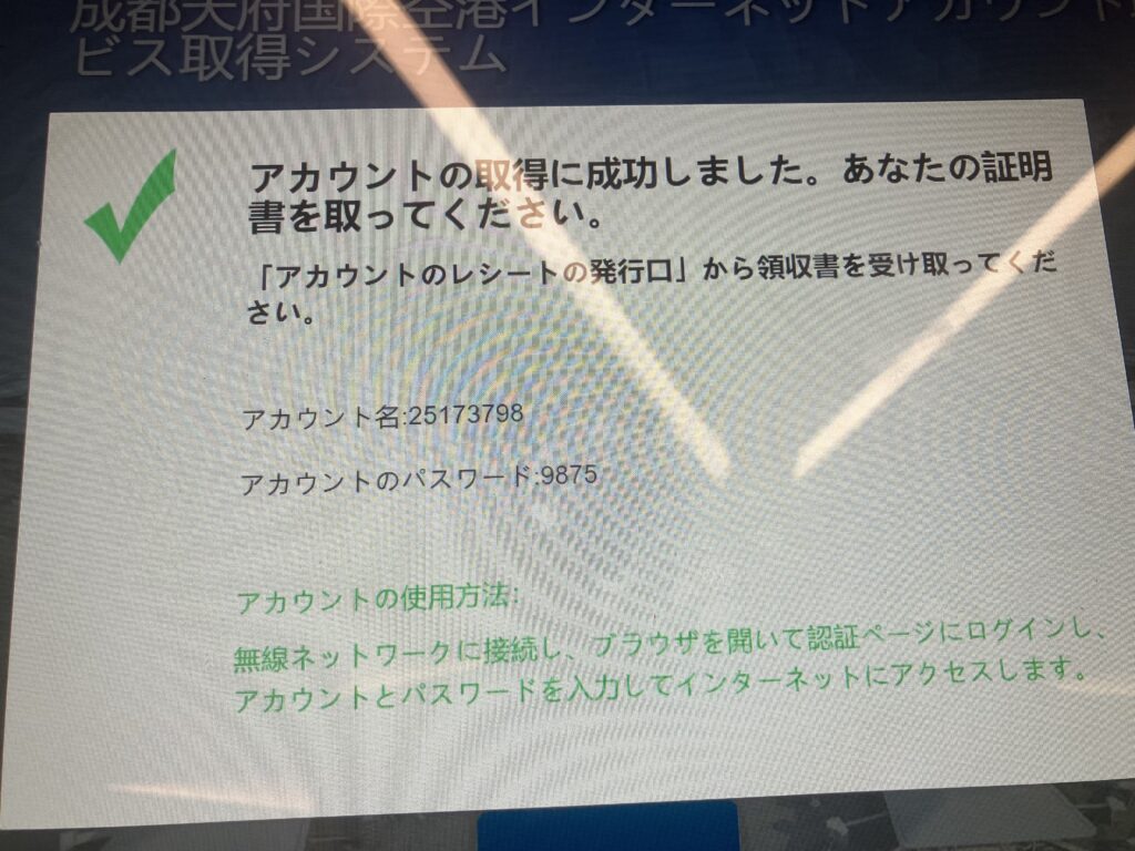成都天府空港のWifiはインフォメーションデスク近くの端末でパスポートをスキャンして個別のIDとパスワードをもらわないと使えませんので、要注意です!端末の言語は日本語に変更が可能です。