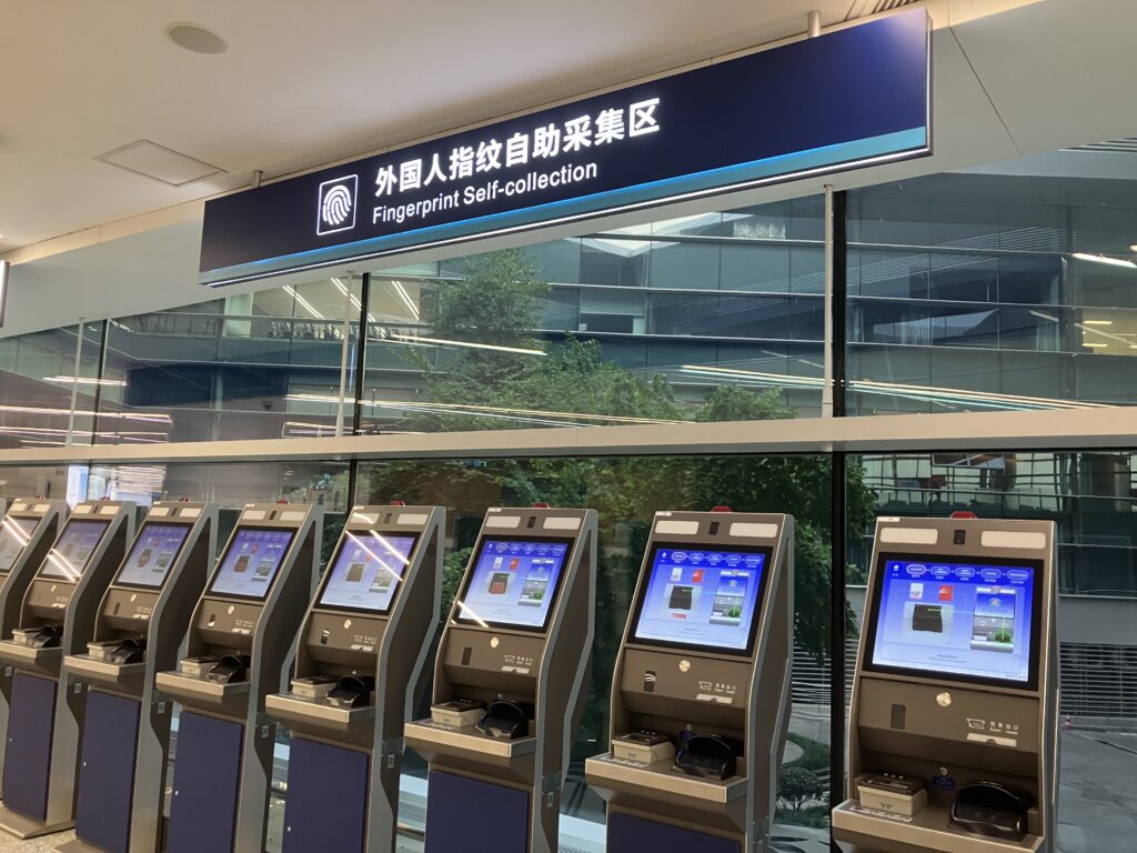 成都の空港に到着したら、Arrivalの看板に沿って進んでいくと、まず指紋登録の機械がありますので、そこでパスポートをスキャンして自分の指紋の登録をします。言語は日本語に変更することも可能です。