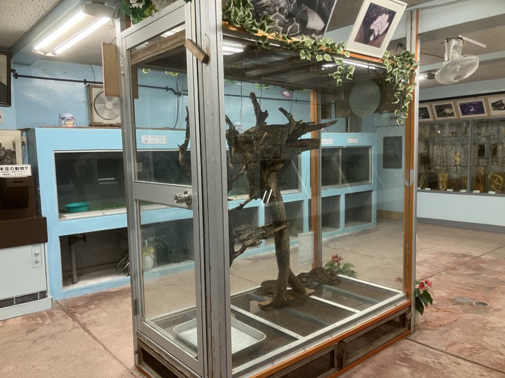 特に真ん中の大きなガラスケージには大量のハブが入っており、何匹も折り重なってハブのおまんじゅう状態になっています。