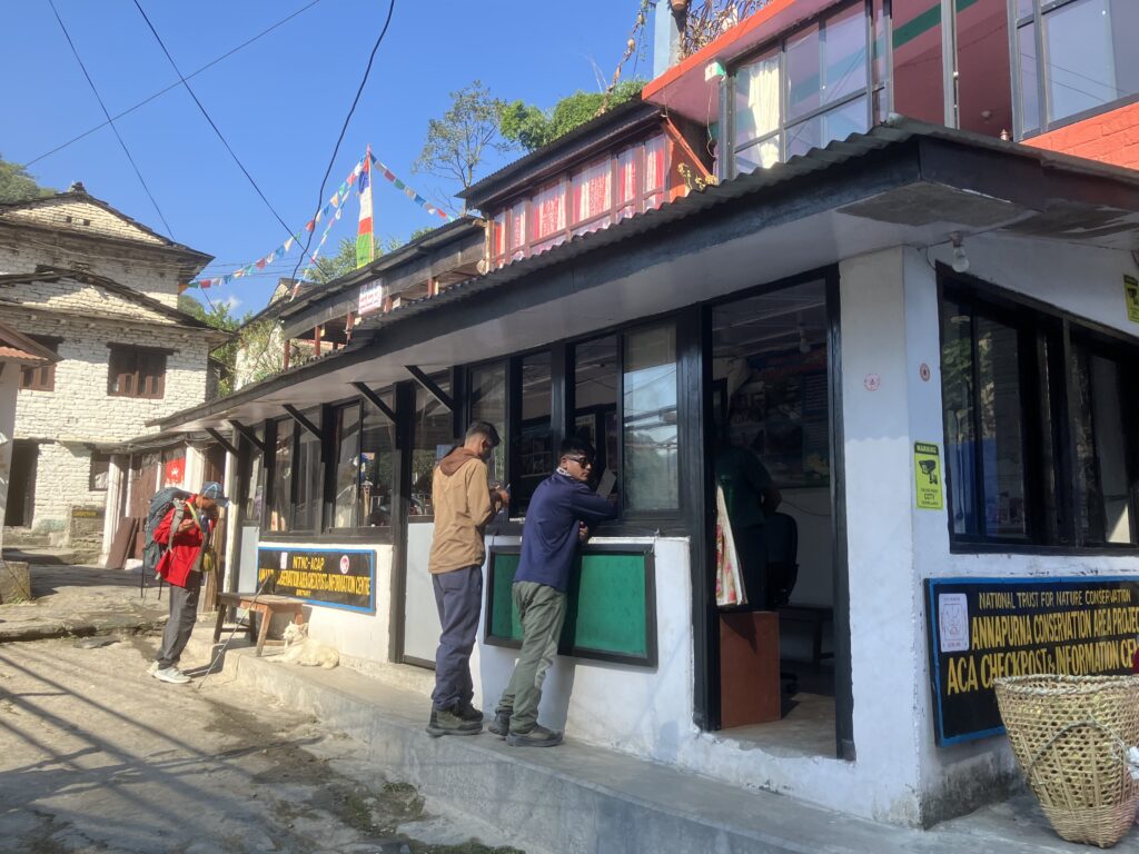 ここでACAP(アンナプルナ保護区入場許可証(Annapurna Conservation Area Permit)の略)のチェックポイントがあるので、旅行者は必ずここで登録をする必要があります。