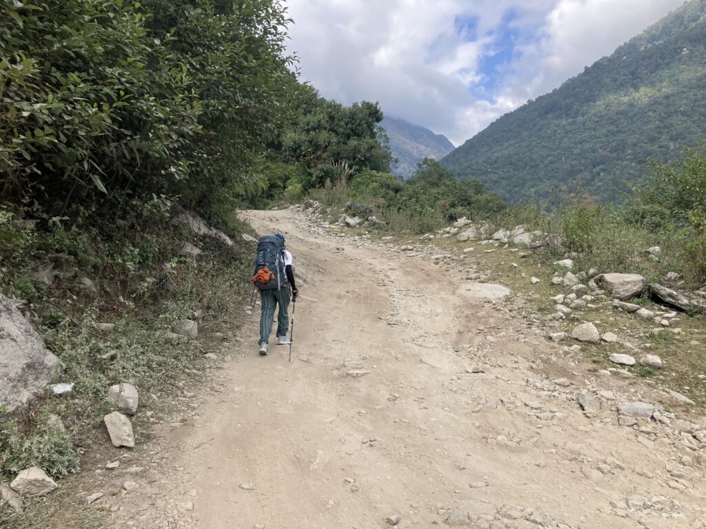 ナヤプル(1,050m)で車を降りたら、下り坂を下がる道から4日間のトレッキングがスタートします。