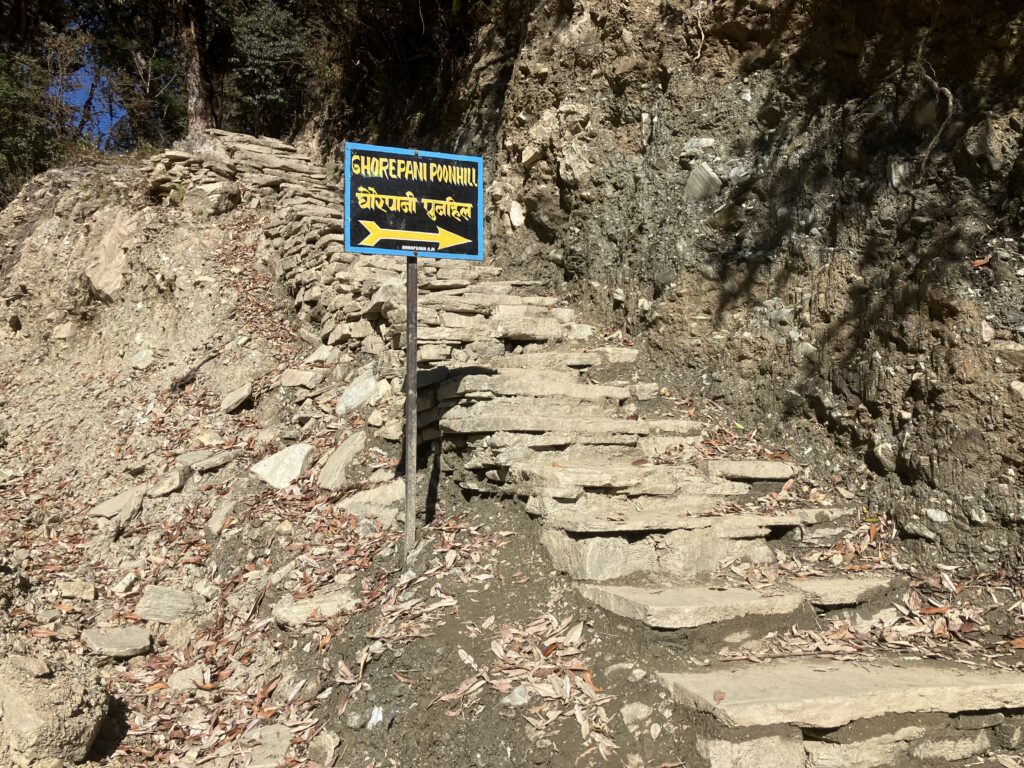 それ以降は山道を進んでいくのですが、進むとすぐに2つに分かれる場所につきます。左側は今までと同じような山の道、右側には「Ghorepani→」の看板が出ており、石段を降りて進む森の道です。