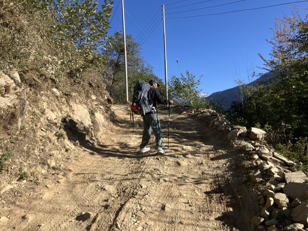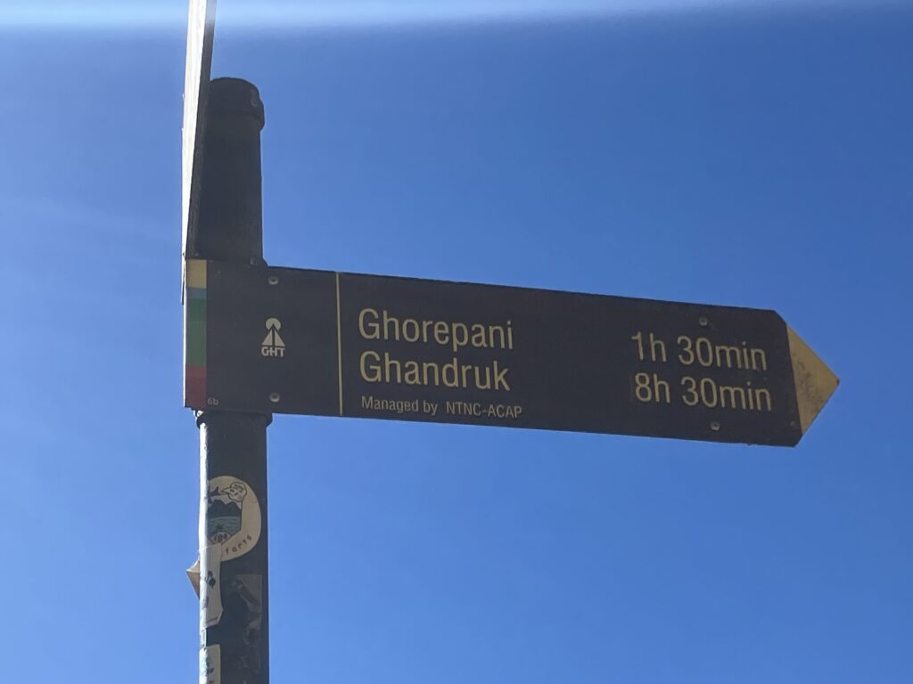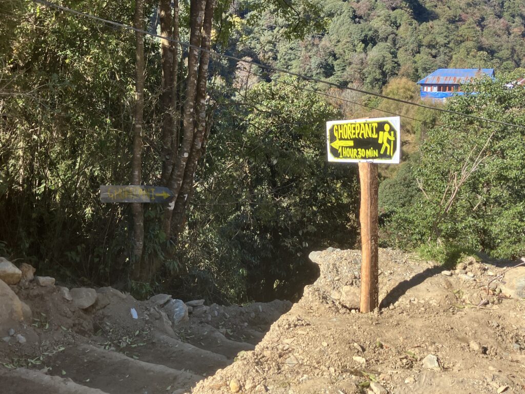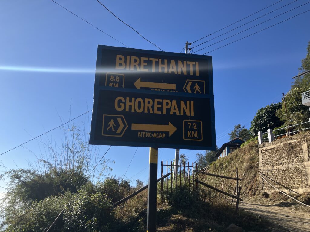 30分ほど石段を進んでいくと、「Birethanti← Ghorepani→」という看板が出てきたところで石段の道が終了します。