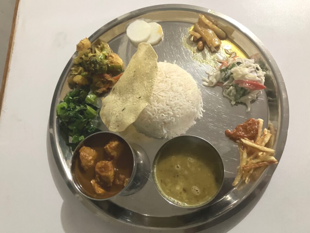 夕食はチキンカレーのダルバートを選びました。無料でネパールの蒸留酒であるロキシーをもらいました!
