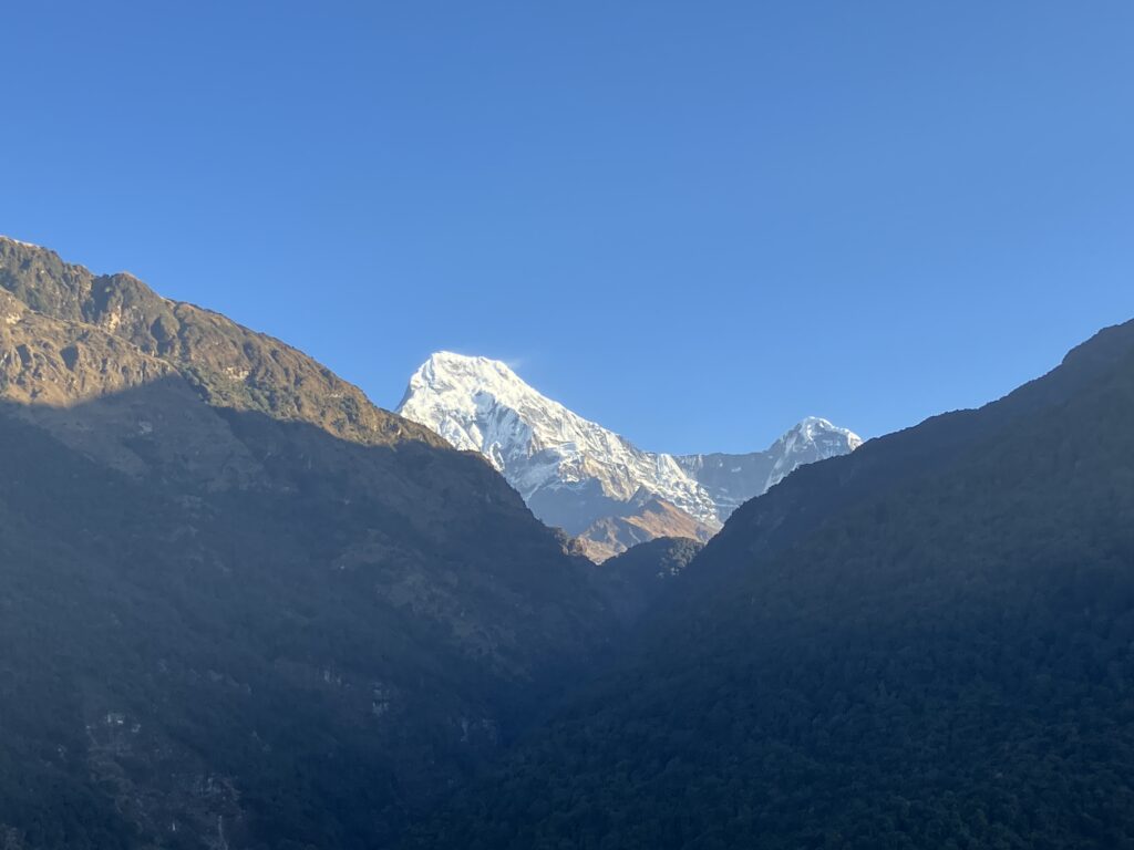 ウレリの宿で朝起きると、部屋の窓から左にアンナプルナ・サウス(Annapurna South、7,219m)、右にヒウンチュリ(Hiunchuli、6,441m)が雲一つなくキレイに見えました!