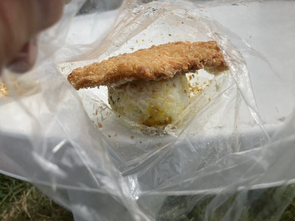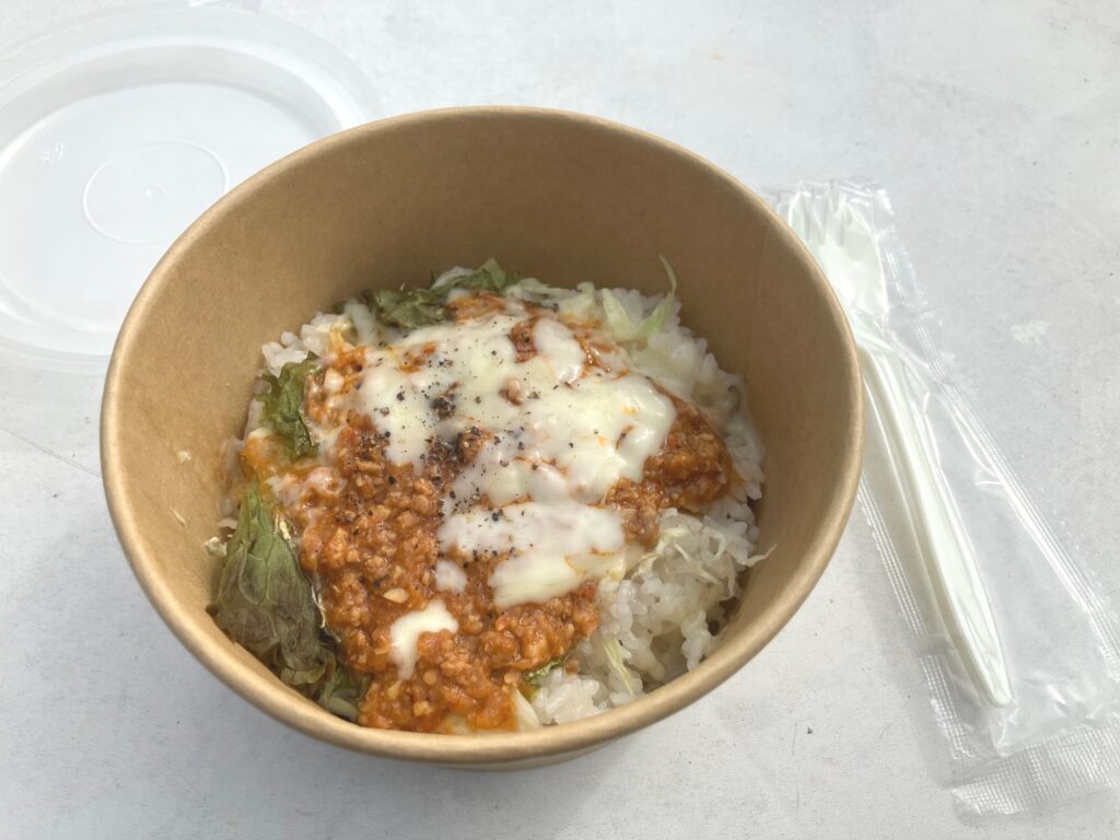 いただいた料理はタコライス800円とおにササ300円です。おにササはおにぎりと鶏ささみ揚げをビニール袋に入れて一緒に食べる、沖縄のB級グルメです。