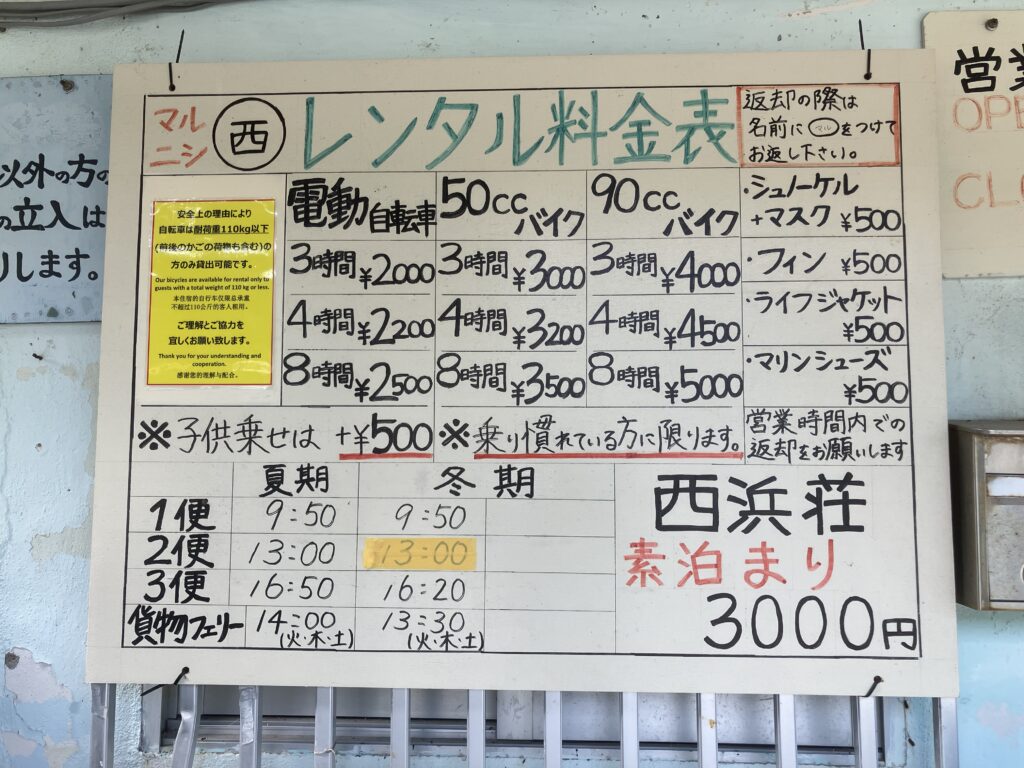 他にも短い時間であったり、バイクやシュノーケリングのレンタルもしていたので、料金表の写真を記載しておきます。