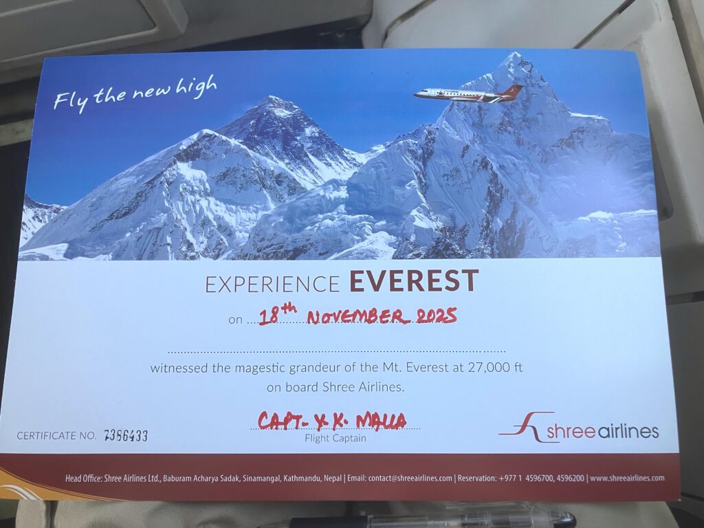 最後にキャプテンのサインと日付の入った、A4サイズのエベレストフライトの搭乗証明書をプレゼントしてくれます!これがとてもうれしかったです!