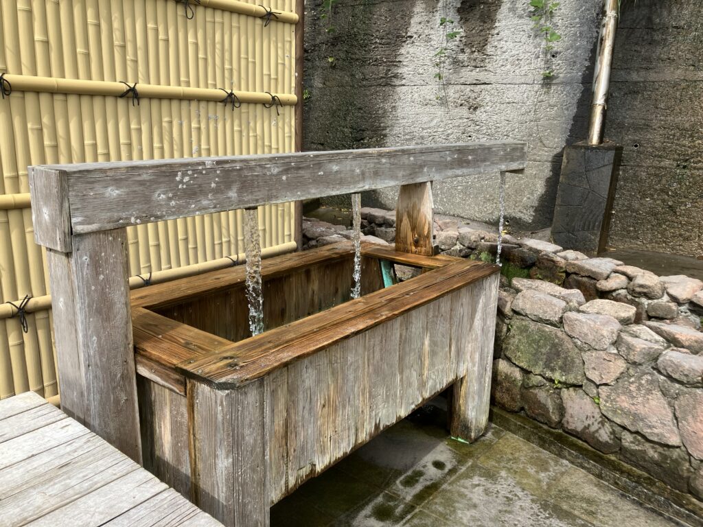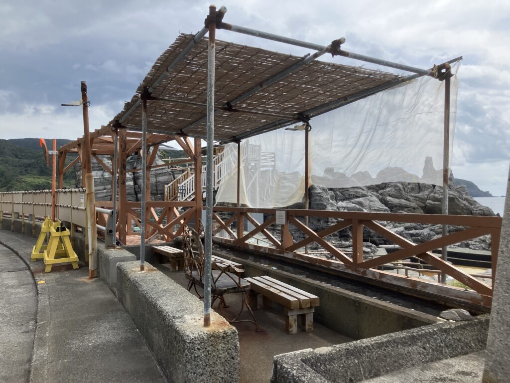 海岸側に露天風呂があり、小露天風呂、大露天風呂、展望露天風呂の3つがあります。2025年10月現在、大露天風呂だけお湯が入っていませんでした。露天風呂へは館内の廊下から入ります。男女混浴で水着着用が必須です。