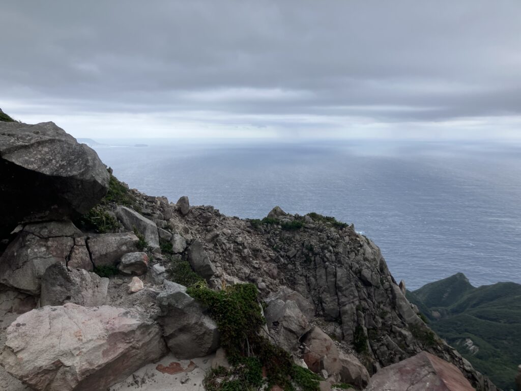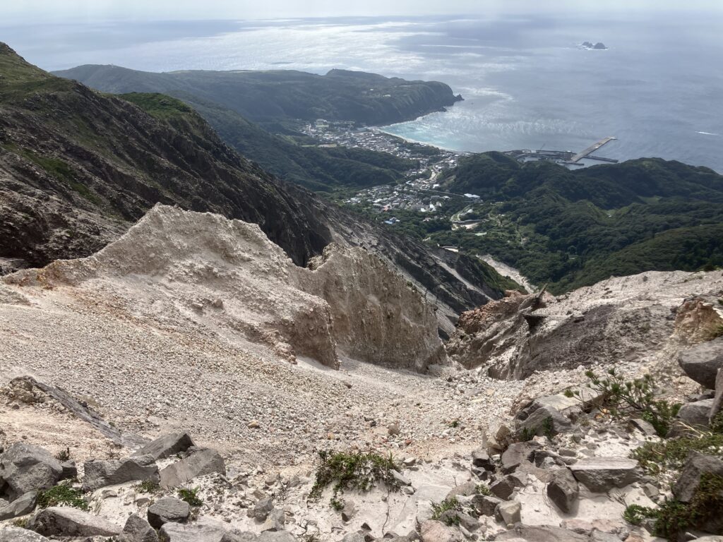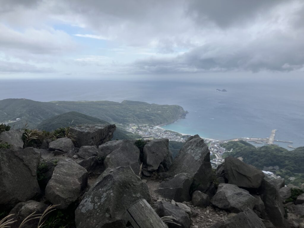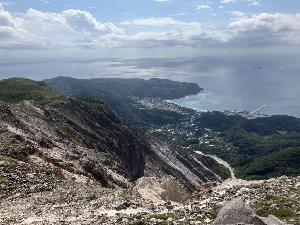 天上山の頂上です!神津島港や町が下の方に見えます。非常に切り立った崖が近くにあるため、落ちないようにご注意ください。