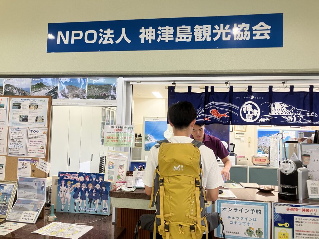 登山とは少し話がずれますが、神津島港に到着後、私は神津島観光協会のサイトから宿を予約したため、乗船ターミナル内にある観光協会の受付で、宿泊代を支払いをし、荷物を預けて山登りに出発しました。