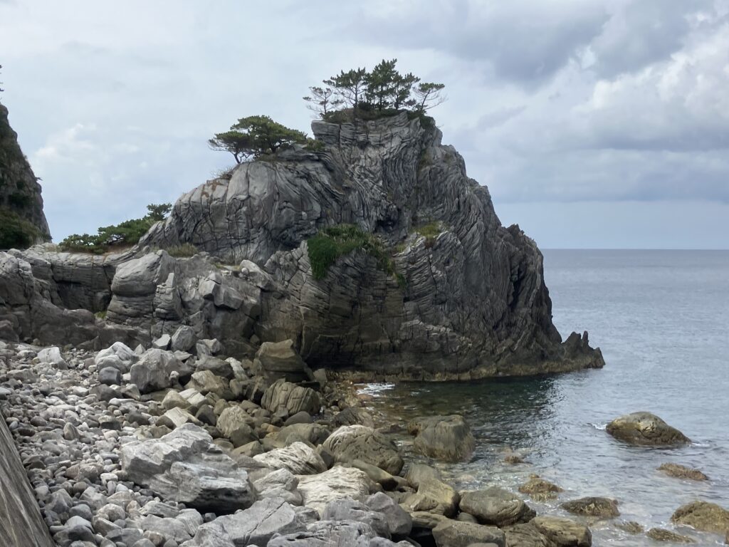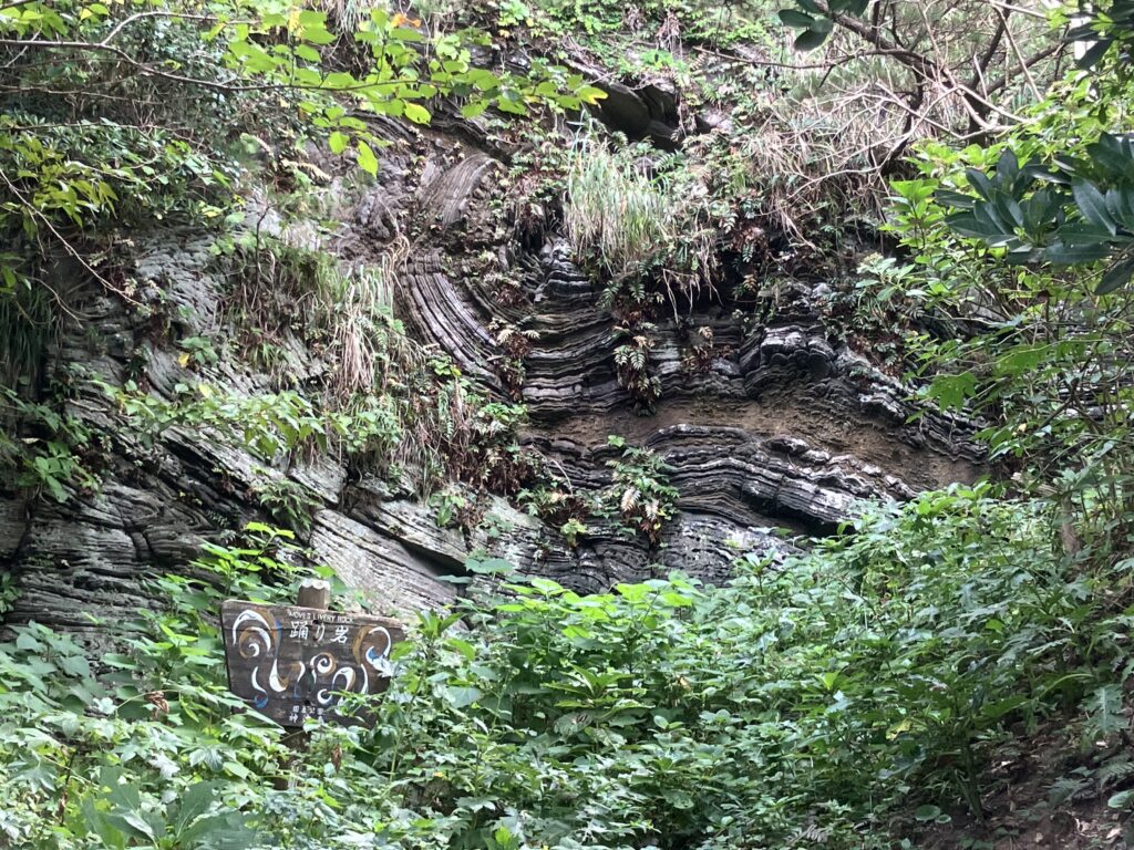 赤崎遊歩道から南へ15分ほど進むと、道沿いの左手に踊り岩が見えてきます。地殻変動でグネグネ曲がった地層が非常に不思議な形をしています!