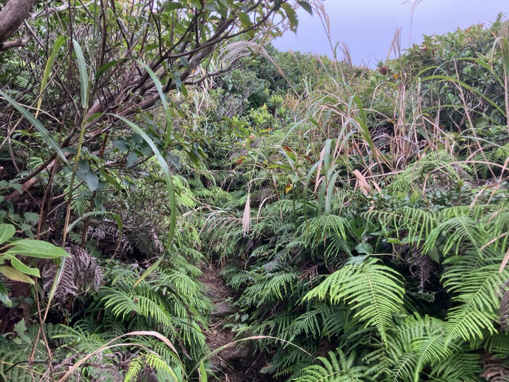 この辺から登山道が細く、よりうっそうとしており、木々や草をかき分けながら進まないといけなくなります。