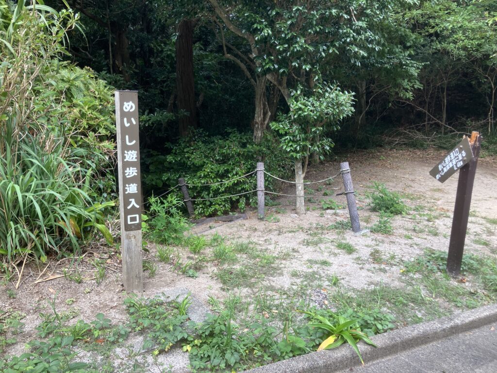 めいし遊歩道は神津島温泉保養センターを通り過ぎたところに入り口があり、遊歩道を進んでいくと、丘の上の神津本道が出口になります。