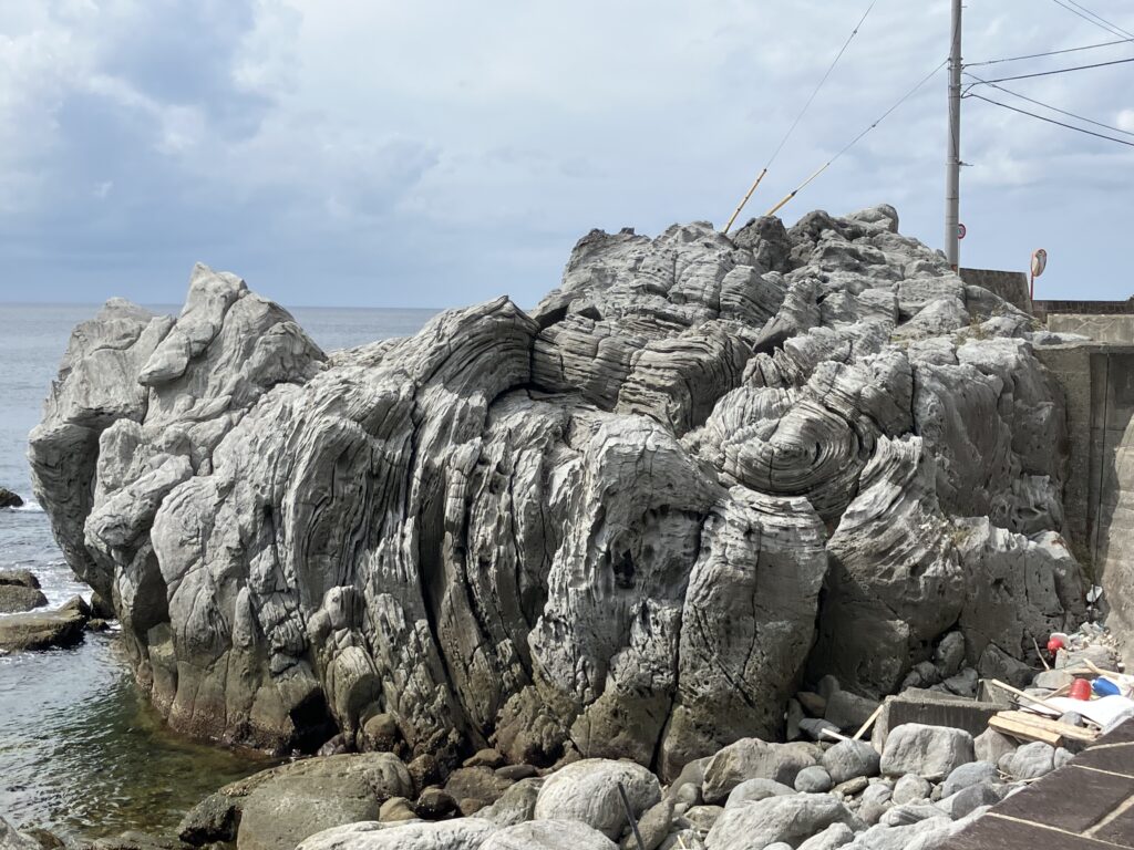 めいし遊歩道近くの地層がグネグネの岩