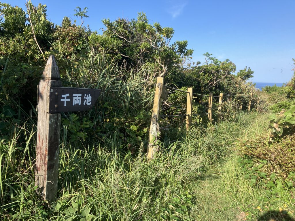 神津島灯台から千両池へは近道の脇道があるのですが、大きなクモやクモの巣だらけのため、途中で断念しました。