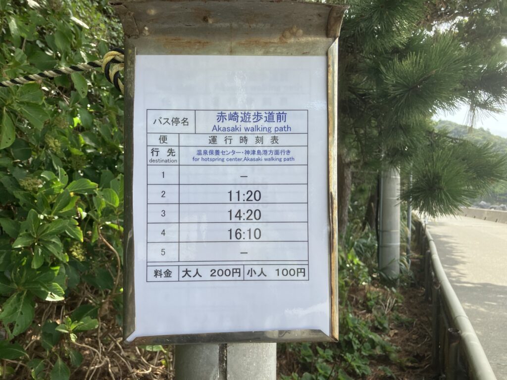 私は、11時に神津島港からバスに乗って赤崎遊歩道へ行きました。料金は200円でPayPayでも支払えます。15分で到着します。バスは1日に4本しか出ていないため、利用する場合は事前に時間をご確認ください。