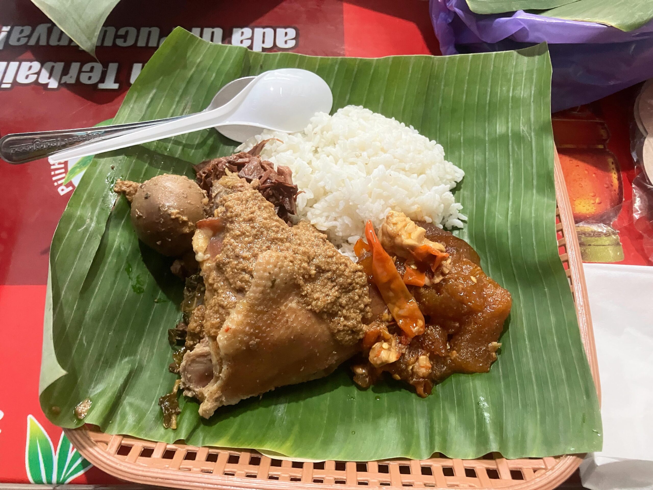 ジョグジャカルタの郷土料理です。ニワトリとジャックフルーツの煮込みのぶっかけご飯です。