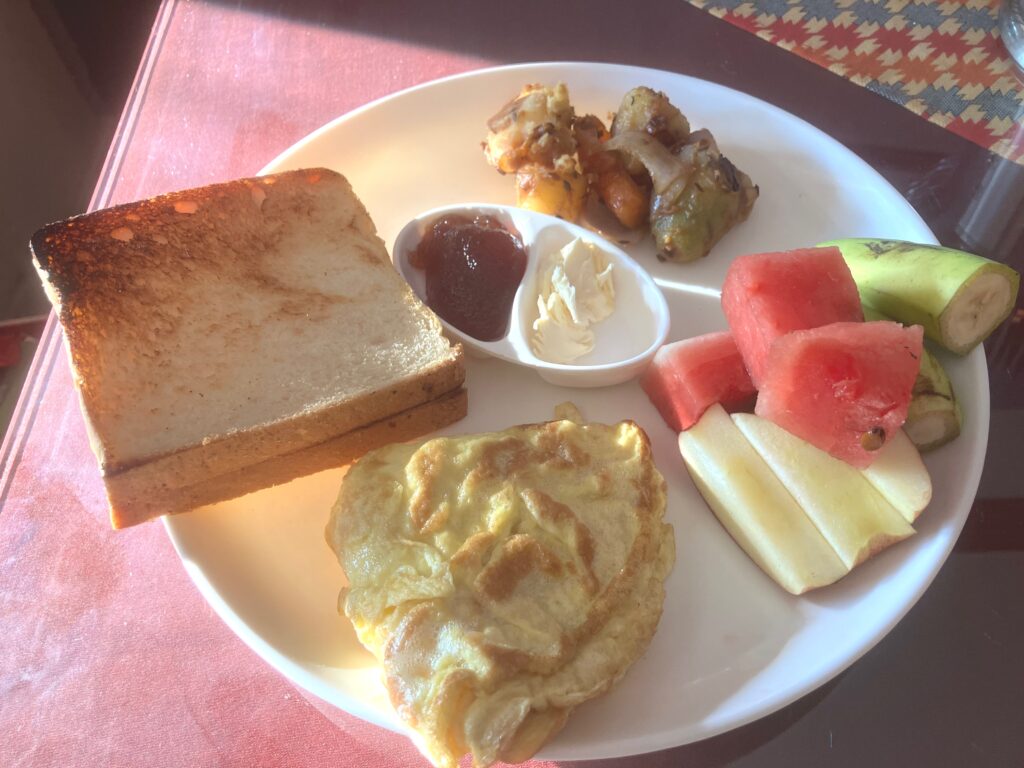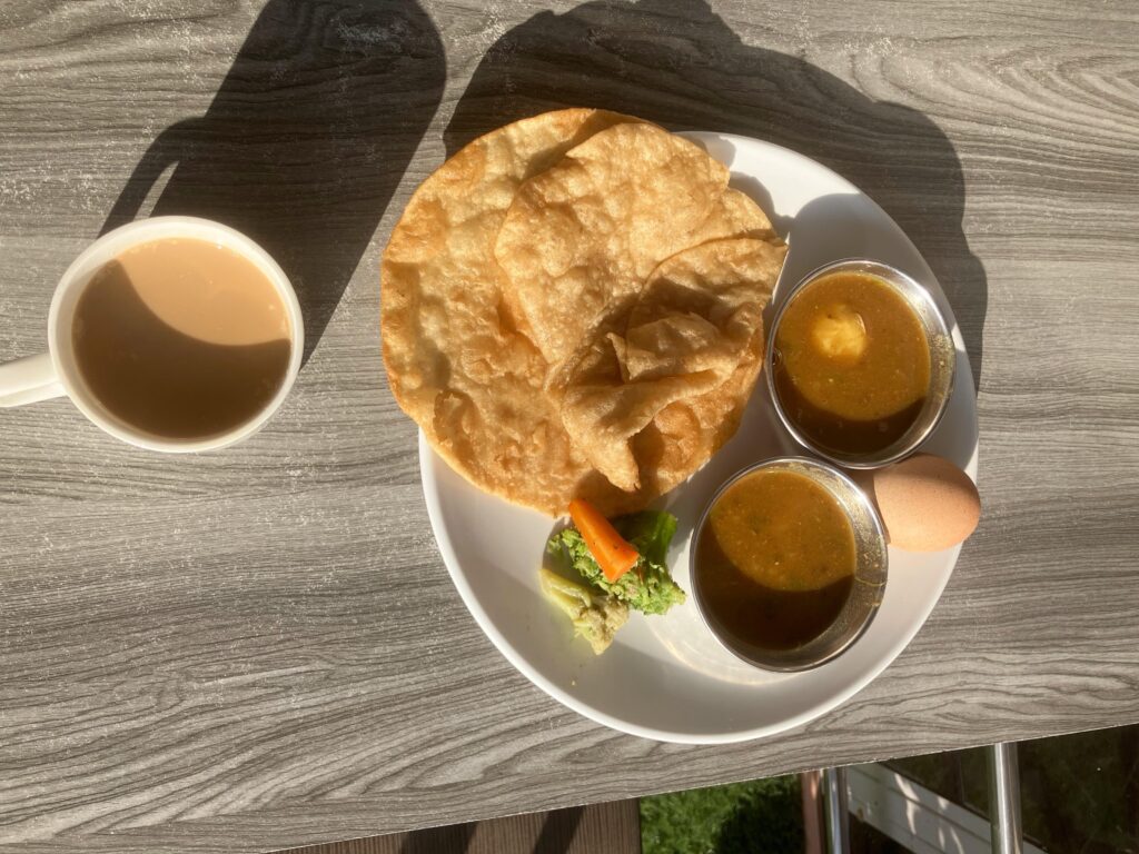 ホテルで食べた朝食です。バトゥーラーと呼ばれる揚げパンと共にチャナマサラを食べる、北インド料理です。