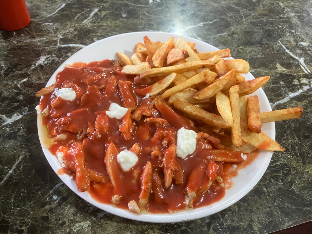 トルコのナンのようなパンを下に引いてケバブの肉を乗せて、上からケバブソースとヨーグルトソースをかけたものです。