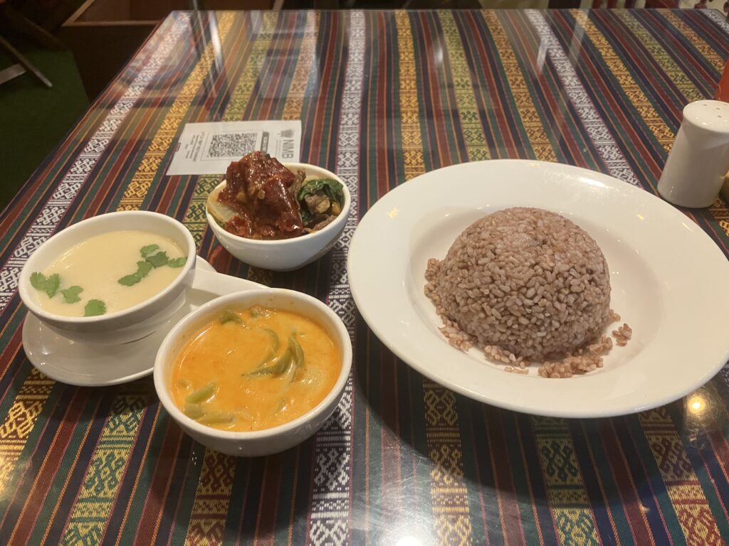 エマダツィ(Ema Datshi)、水牛肉のパクシャ・パー(Phaksha Pa)、スープ、レッドライス(Bhutanese Red Rice)のセットでした。