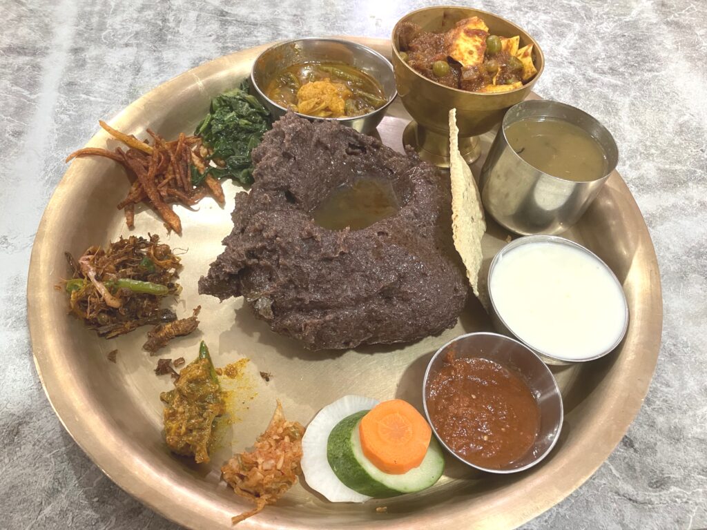 パニールという南アジアの代表的なチーズを入れたカレーのダルバート。主食はお米ではなく、蕎麦がきをこねたディドです。