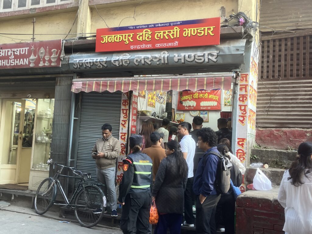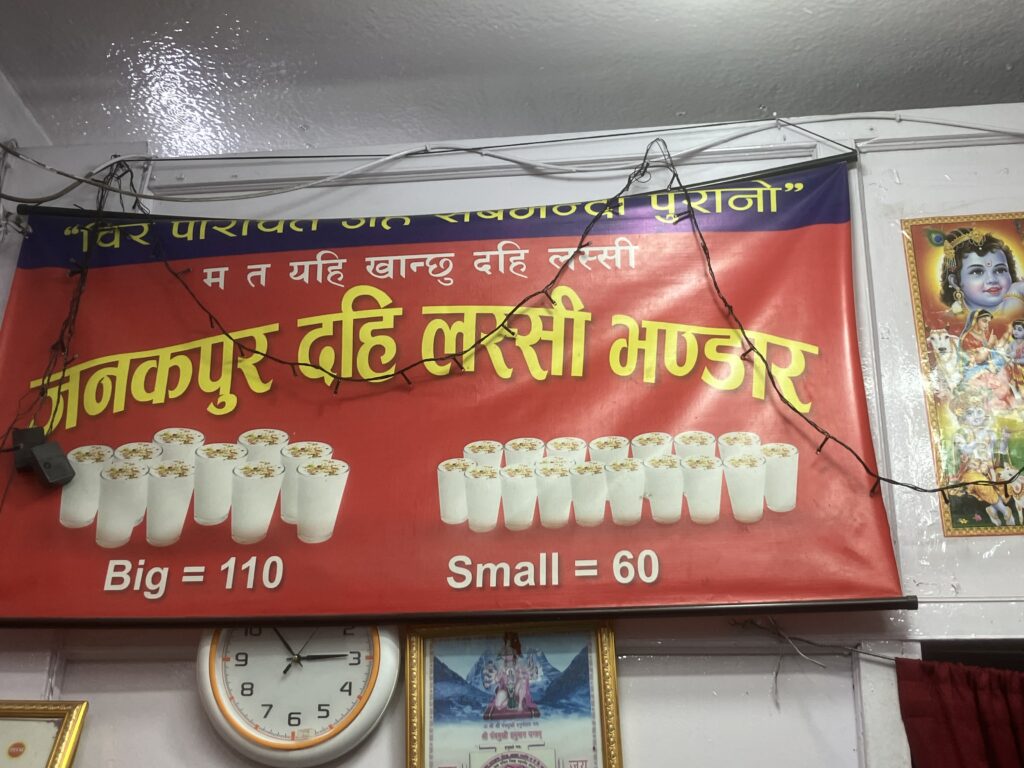 Janakpur Dahi Lassi Bhandarという名前の小さなお店です。ネパール語でしかお店の看板が書かれていませんが、いつもたくさんの地元の人が並んでラッシーを飲んでるので、すぐに分かると思います!