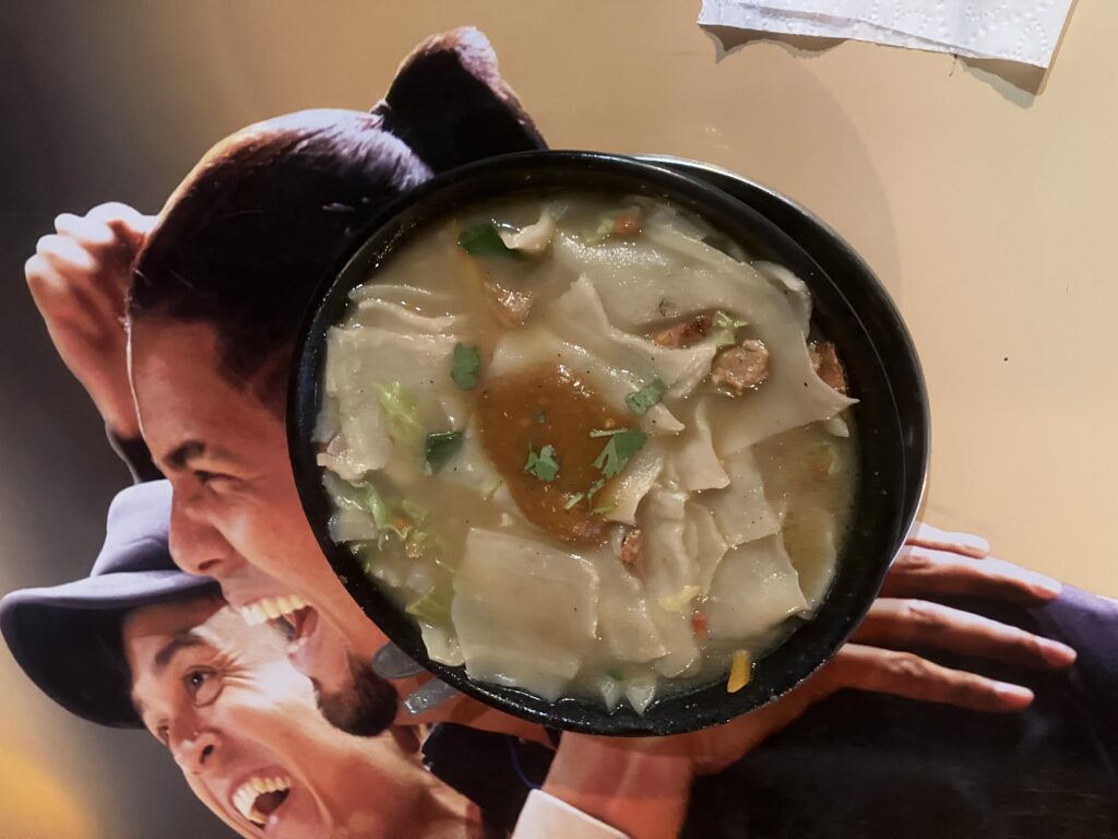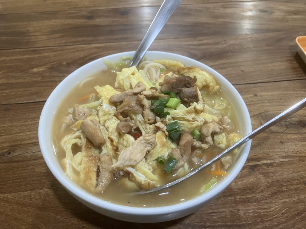 きしめんのような、ほうとうのような麺を使ったスープ麺です。具材はチキンと野菜がたくさん入っており、本当においしかったです!