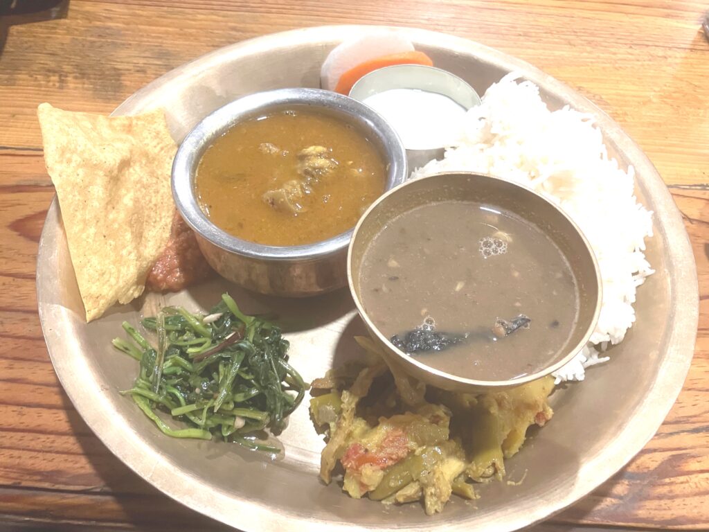 ネパールを代表するカレーや惣菜などをワンプレートに乗せたご飯がダルバートです。ダルは豆、バートはご飯を意味しています。今回は、マトン、チキン、水牛の肉からマトンを選びました。