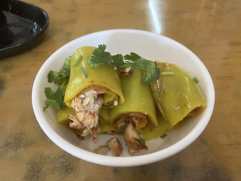冷たい平たい麺で具材を巻いたチベットの軽食です。もちもちした食感は日本人の好みに合うかと思います。具材はプレーン、チキン、野菜、水牛などいろんな種類があります。