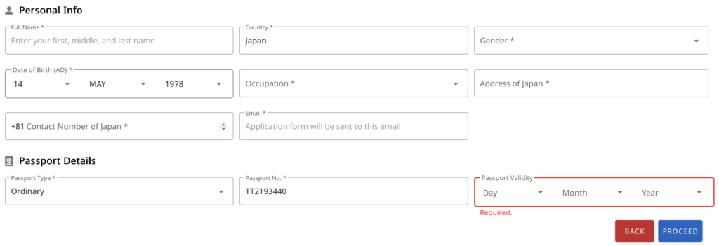 A. オンライン申請書のサイトに入り、国籍、パスポート番号、誕生日を入力して「PROCEED」を押してください