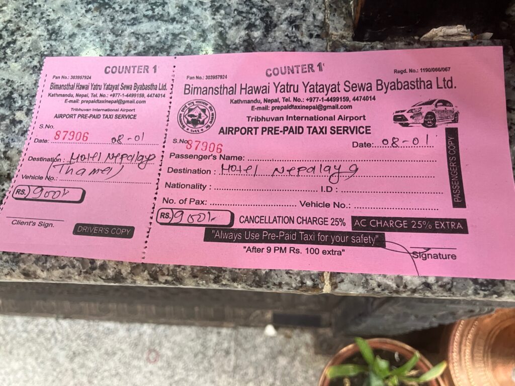 プリペイドタクシーのバウチャー。タメル地区まで900NPR