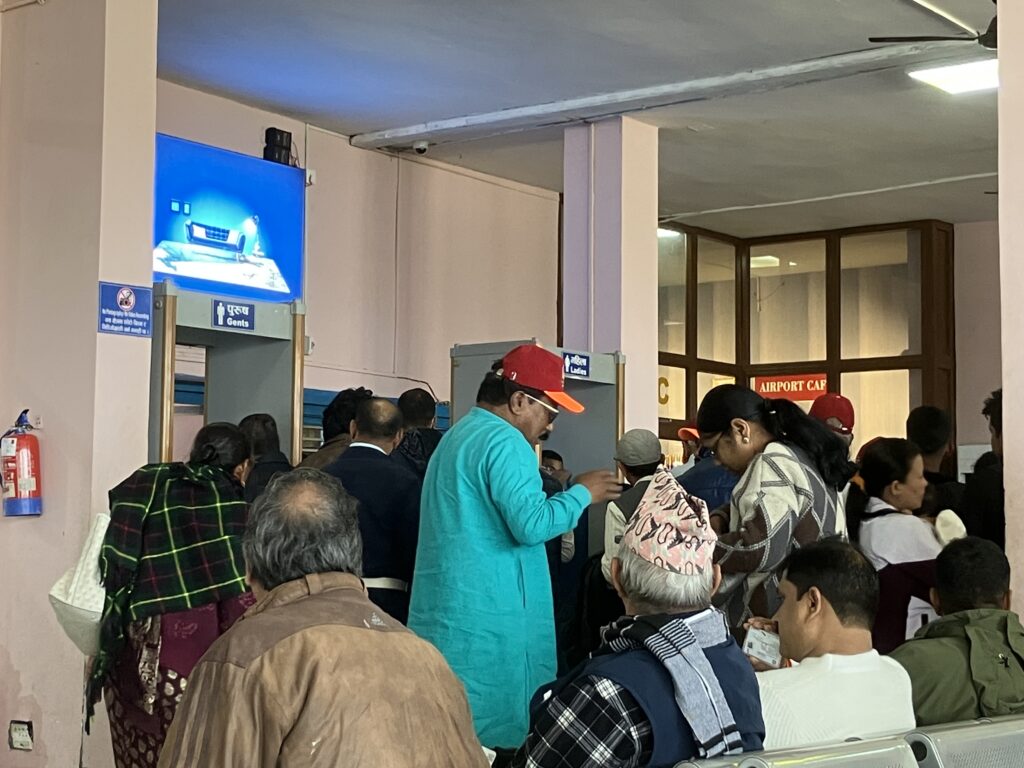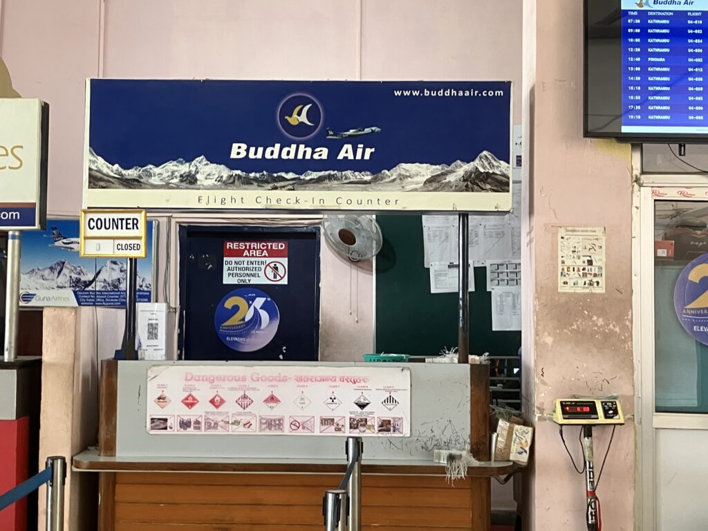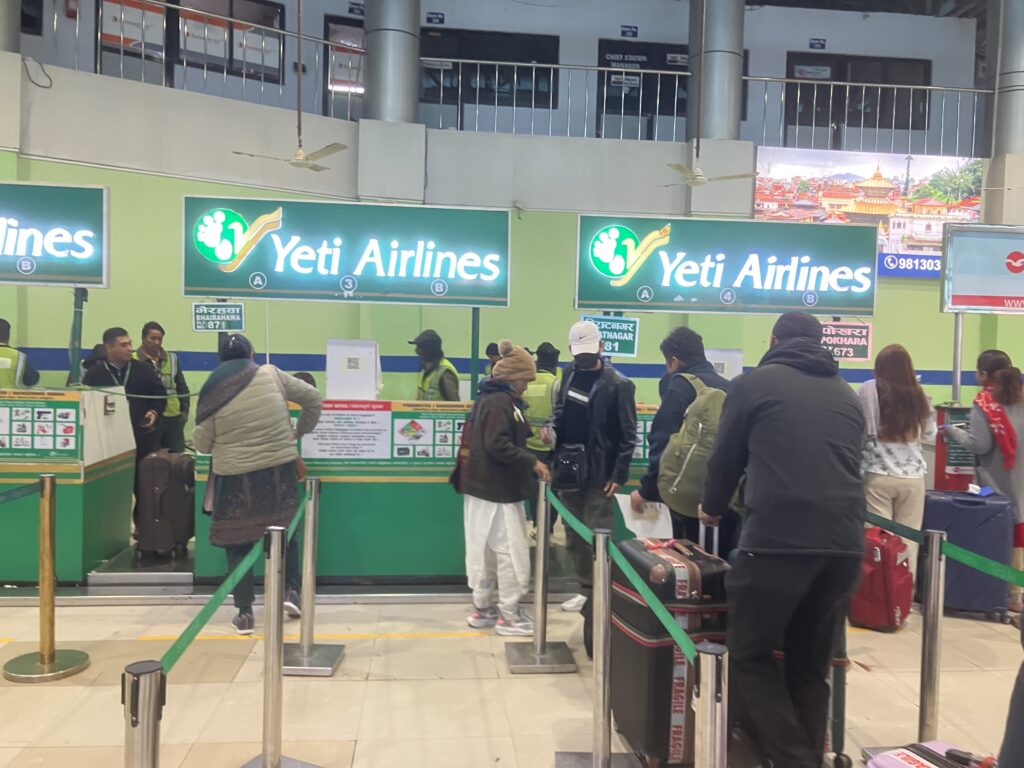 カトマンズ空港に到着したら、国内線ターミナルに入る前に簡単なセキュリティチェックがあります。それをすぎると左手に色々な航空会社のカウンターがあるので、自分の航空会社のカウンターを探してチェックインをしましょう。