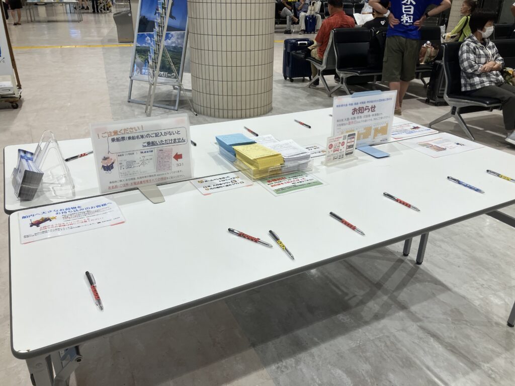 ボールペン類がなければ、ターミナル内にいくつかボールペンが置かれた台が置いてあるので、そちらを利用して記入をしましょう。