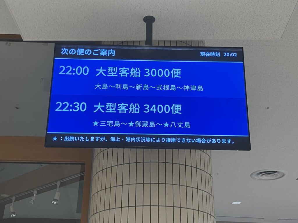 時刻表も基本的には毎日同じで、東京の竹芝桟橋の出港は夜となり、島に到着するのは翌朝となります。逆に島から竹芝桟橋への帰りは日中の運行となり、夜に竹芝桟橋へ帰着となります。