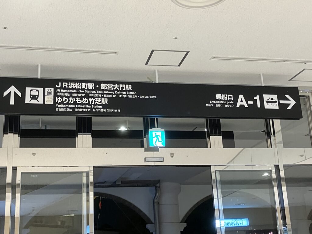 竹芝桟橋は、浜松町駅から徒歩で15分ほどの距離にあります。20時半過ぎから有人カウンターでチェックインが開始されます。