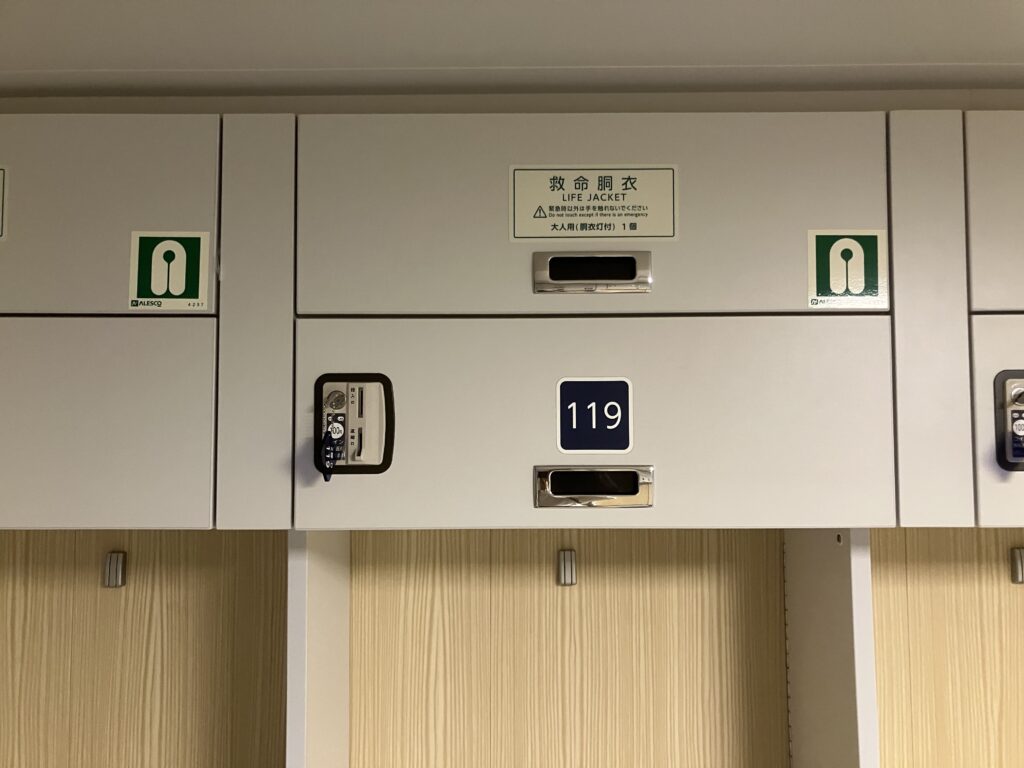 乗船券にはそれぞれの席やベッド、和室の床の番号が印字されています。2等和室は自分の床の上の方に小さな鍵付きのロッカーがありました。
