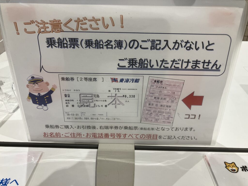 乗船券が出てくるので、右側の半券に名前の漢字、電話番号、住所(市区町村までで可)を記入する必要があります。