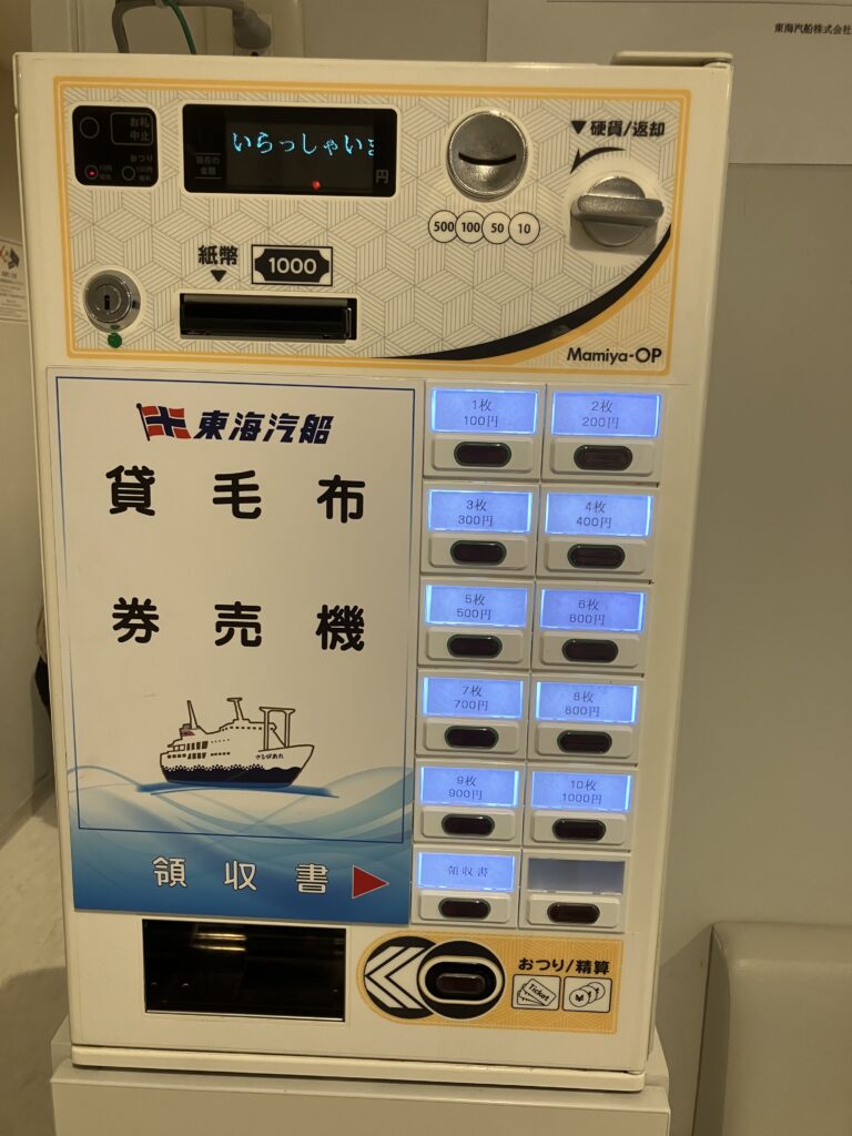 各階に毛布やベッドマットなどのレンタルの自動販売機もあります。毛布は1枚100円です。自動販売機でチケットを買ったら、係員のいるカウンターまで行って、チケットと毛布を交換する感じです。